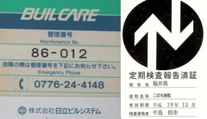 当館は、非常階段が上記の通りございますので、「防火点検検査済み証」を掲示、毎年更新いたしております。